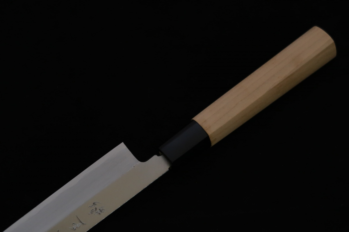 [スペック/ SPEC] 〈ブランド/Brand〉宗正 Munemasa 〈産地/Producing Area〉堺打刃物 Sakai, Osaka 〈全長/Full Length〉380mm 〈刃長/Blade Length〉240mm 〈刃厚/Thickness〉4mm 〈本体重量/Weight〉145g 〈地金/Cladded Steel〉極軟鋼 Soft Steel 〈鋼種/Steel〉日立安来鋼 白紙二号 White #2 〈柄/Handle〉朴にプラスチック Magnolia with Plastic 〈刃付け/Bevel〉片刃 Single Bevel 〈姿/Shape〉柳刃 Yanagiba |