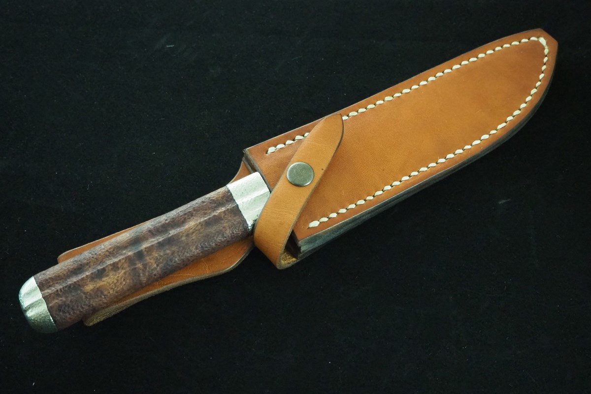 刀匠・竹花一貫斎繁久作 玉鋼洋白鉄刀木把小刀5寸・両刃 Swordsmith・ Shigehisa Tamahagane Ironwood Handle hunting Knife 150mm・Double Bevel